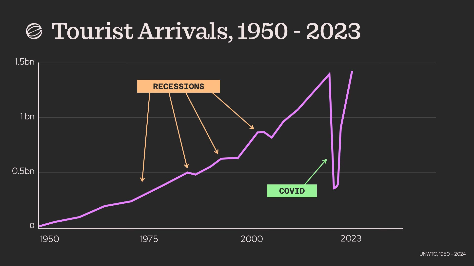 According to the World Bank, the world has experienced four global recessions in the last seventy-five years: in 1975, 1982, 1991 and 2009. During each of these episodes, “annual global GDP per capita contracted, and was accompanied by a weakening of other key indicators of global activity”. Mapping those recessions against arrivals, however, it’s hard to pinpoint any major disruption to travel and tourism other than COVID-19. While there are fluctuations and some dips, there’s one very clear direction of visitor arrivals in the last 70 years: up.