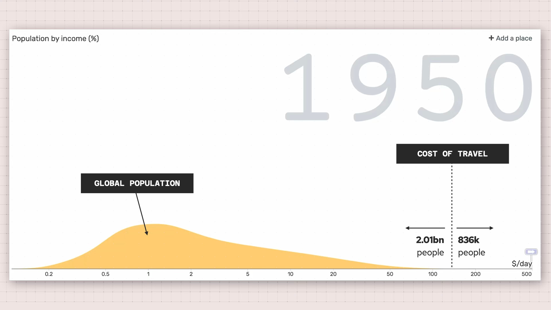 The yellow mountain? That’s the world’s population displaced by daily income. The cost of travel in the 50s is set at $147 a day. To convey just how inaccessible travel was in the 1950s, there are so few people earning more than $147 a day that they’re not even visible in the visualization.