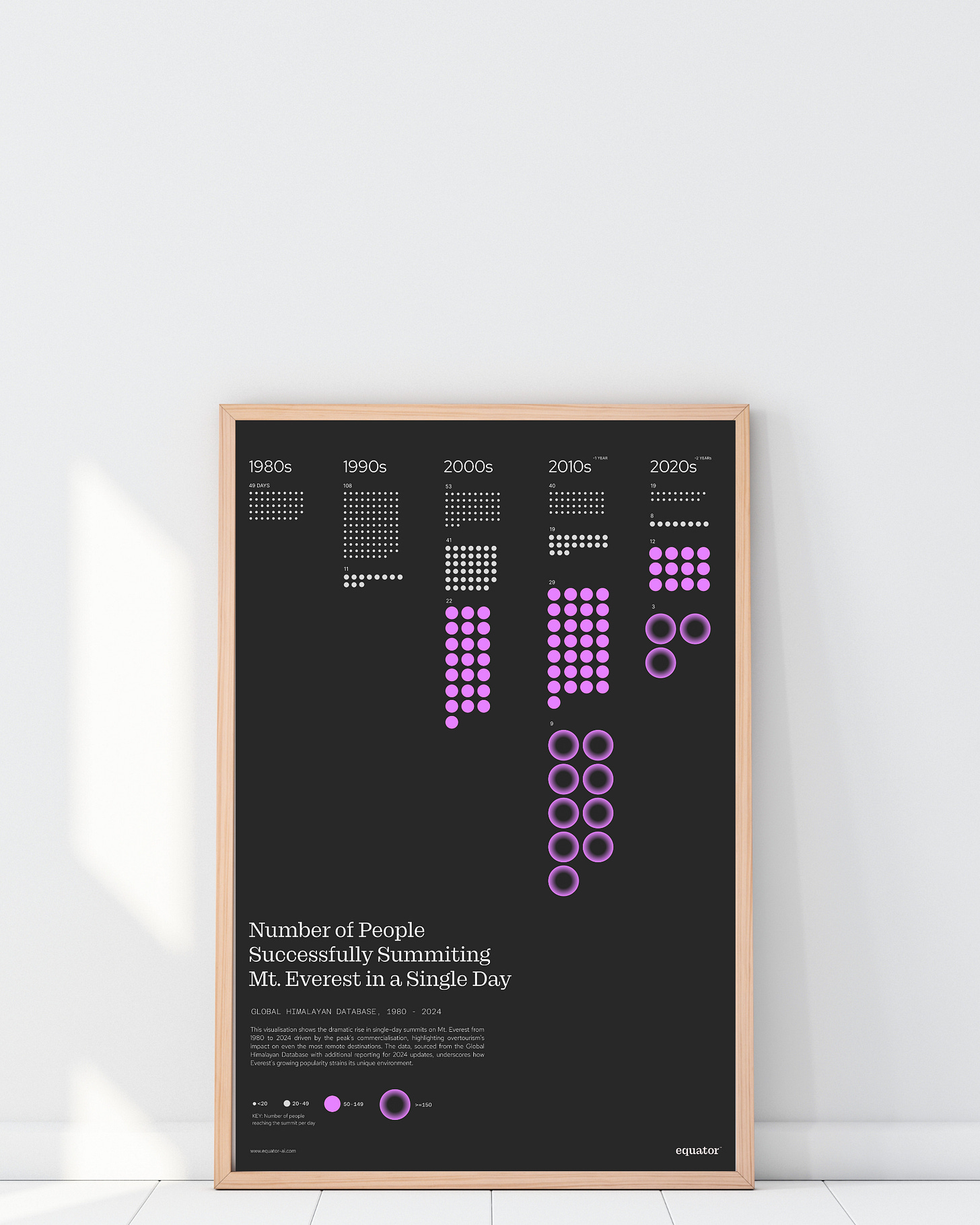 This visualisation shows the dramatic rise in single-day summits on Mt. Everest from 1980-2024 driven by the peak’s commercialisation, highlighting overtourism’s impact on even the remotest destinations.
